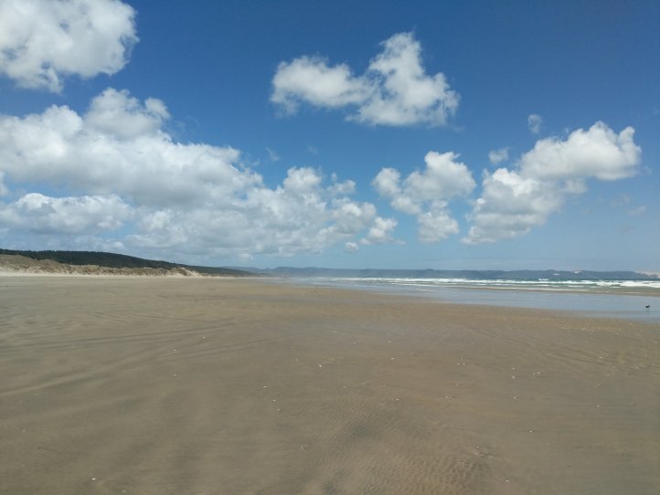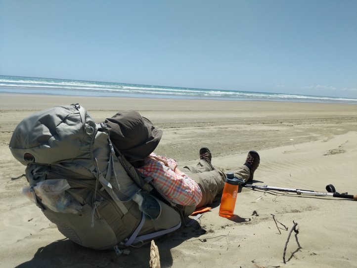 Really tough day on the beach, we had a beautiful headwind, a dazzling sun, and 33km of sand to keep us company. We’re both feeling very sore tonight but happy that we’re done with 90 mile beach (there will be other beaches) and the first real section of the trail. A fairly uneventful day overall. We did experience our first brief New Zealand storm but by the time we’d put on pack covers and rain jackets it had stopped. I ended up hiking with my rain jacket on (with the hood up) all day in an attempt to keep the sun off.