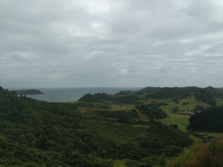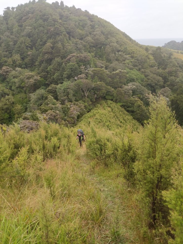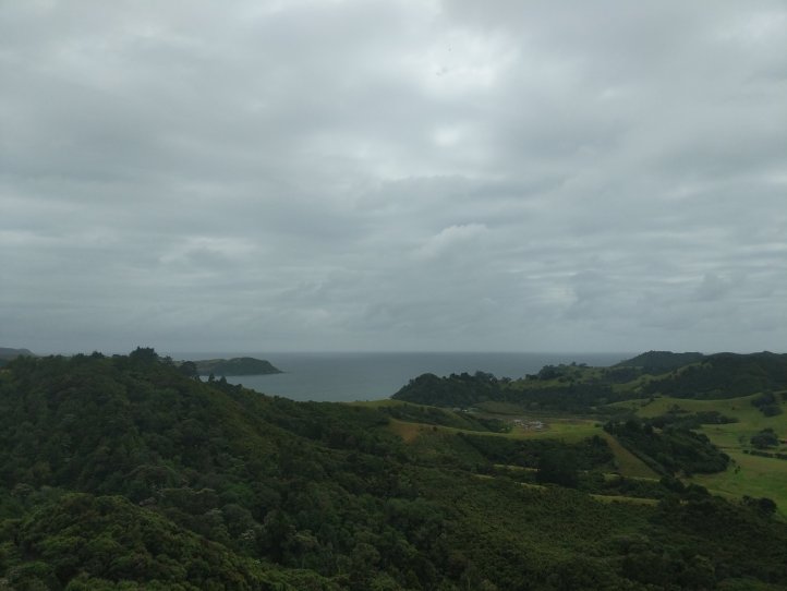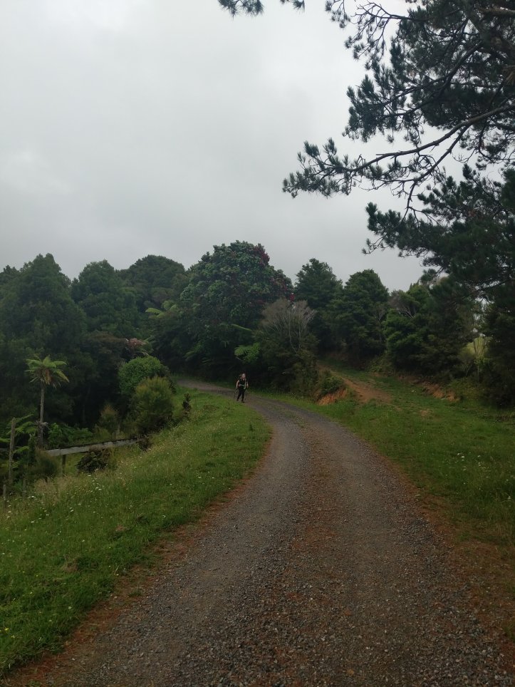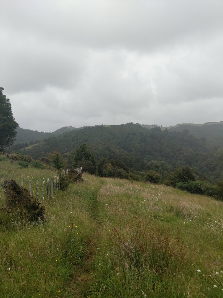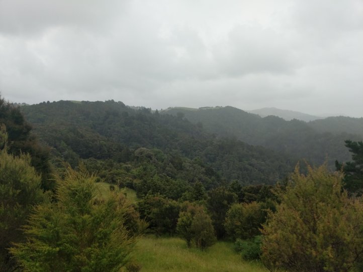 We had our first real test of our tent last night as it started raining around midnight and was still raining when we woke in the morning. Luckily we seem to have passed the test and stayed dry in the tent, we also had a nice big shelter to run into for breakfast and packing up our stuff. We were definitely sad to leave this spot as it had everything we needed and was very relaxing to spend a night there. The rain had mostly stopped by the time we started hiking and we got going with about 10km of road walking to get to the next trail. The Helena Ridge rapidly ascended over 5km through nicely established track and some farmland with great views back to Helena Bay. It was a sweaty climb but rewarding for the views.