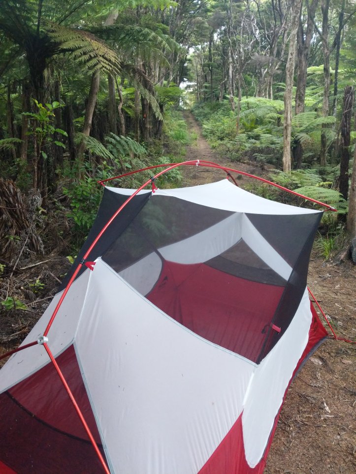 After lunch at the top we spent the afternoon traversing an open ridge that continued to have great views. It was also raining slightly this whole time so we were kept nice and moist. The ridge came to a road and the end of the Helena Track. We walked down the road and after filling up water another 4km down the next trail to set up camp right before the turnoff. It wasn’t the best spot to camp but these jungles are thick and steep so we had limited choices…