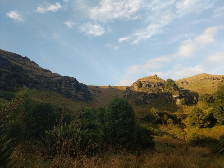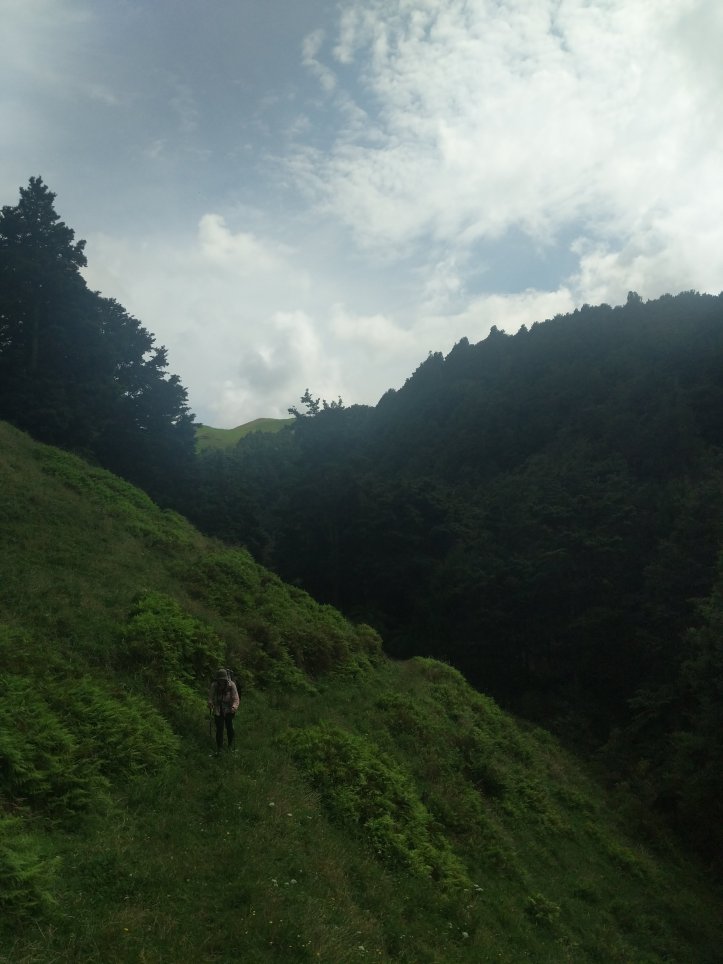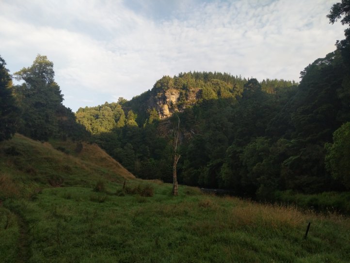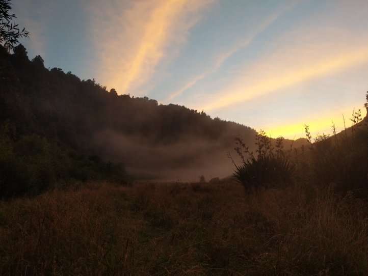 We’d planned on having a huge day today so got started early. We did a quick breakfast and broke camp around 7am. The first part of the trail was listed as “farmland” but the notes also said 5 hours for 15km which is a lot slower than we usually hike. We started out in the valley hiking through mist and were moving pretty fast until I suddenly went knee deep into a bog. It came out if nowhere and looked like what we’d just been walking on but my leg was just lost in the bog. From there on out the trail was a lot of navigating around bogs, sliding across steep muddy terrain trying not to slip into the river, and fighting off prickly bushes. We did get some great views and enjoyed the hike but it did end up taking pretty much the full five hours and we were tired after.