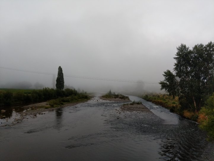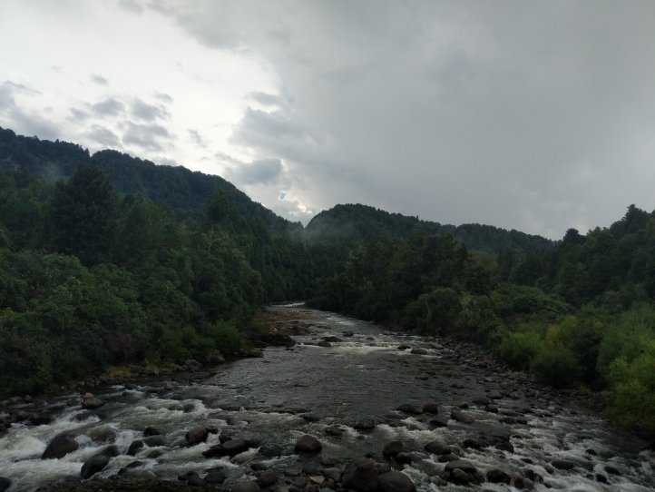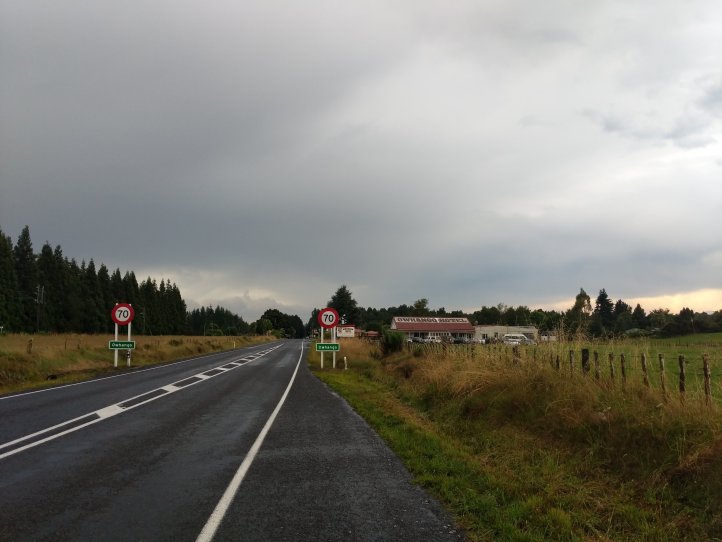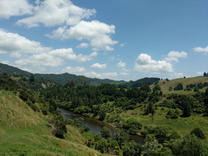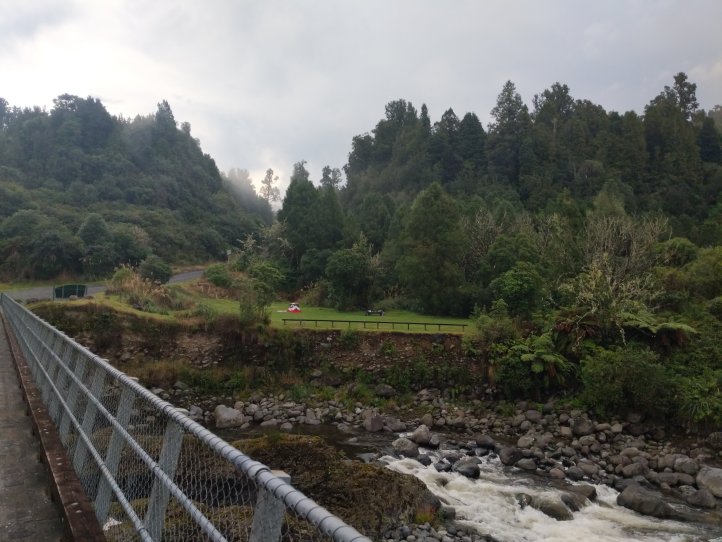 With 10km left to go we reached some clouds that we’d been approaching for awhile. Not long after we started hearing a lot of thunder and not long after that we saw lightning in the distance. We kept going and soon found ourselves taking shelter under some trees on the side of the road as a torrential downpour passed over us which included giant hail balls striking down and hitting our heads. These hurt pretty bad and were easily the size of a golf ball. This eventually passed and we headed down and through Owhango (which doesn’t have a store despite what the notes say) and just passed the town to our campsite. We’re at a little spot right by the river and the start of the 42 Traverse.