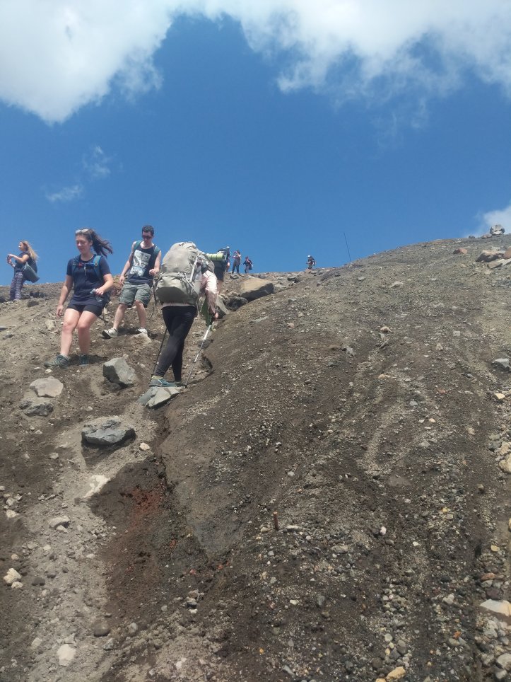 From there it was another 3km to the first hut. You used to be able to stay in this hut but it was damaged (giant lava rocks came flying through the roof) in the 2012 eruption. Now it’s just a spot to rest on the way. By now, about 10am, we were starting to see a steady stream of people already on the way down.