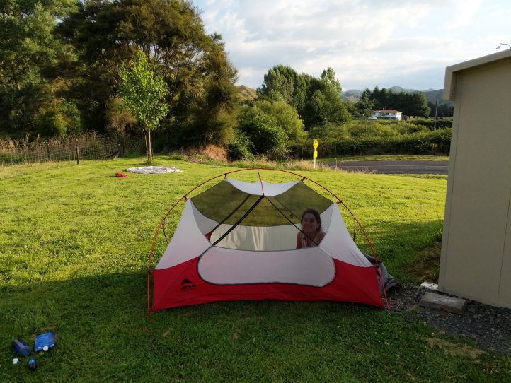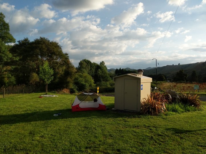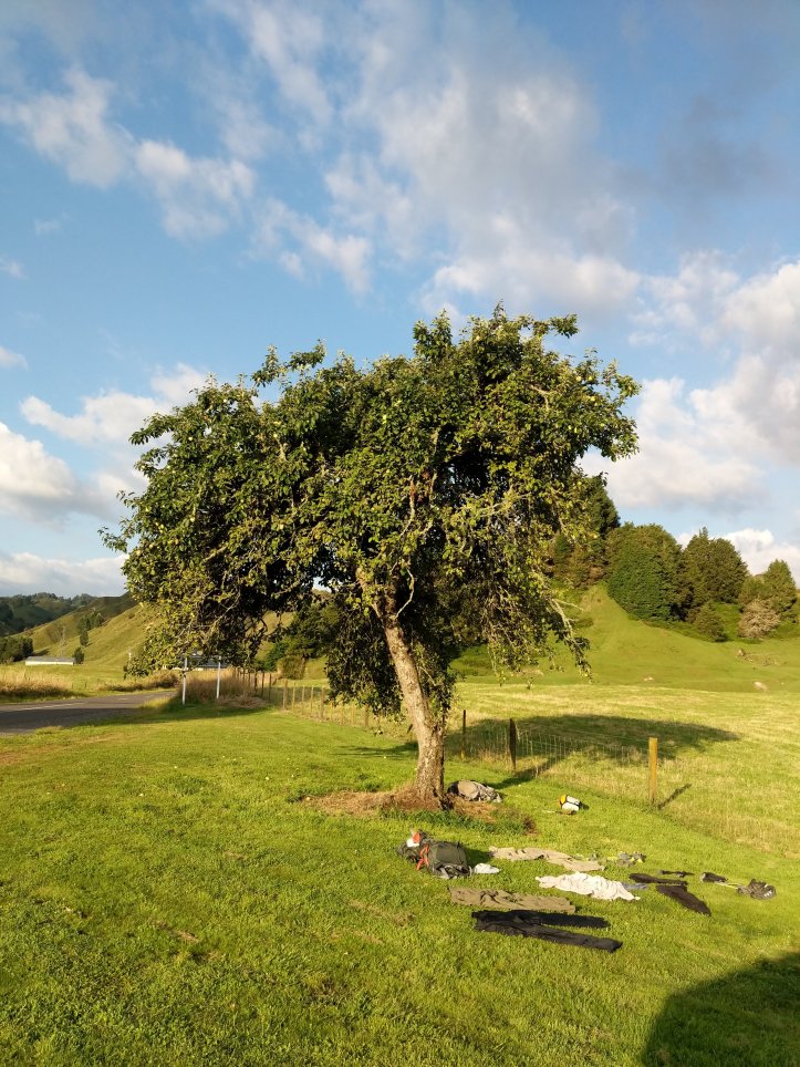 The rest of the afternoon on the road was unbearably hot and certainly not helped by the fact that this road section is actually heading North and not South, so the exact opposite direction we’re trying to go on road in really hot conditions… We reached the campsite around 4pm and immediately spread out remaining wet things out to dry and hide in the shade. We spent a good portion of the afternoon hiding under an apple tree (and eating some sour apples) but after realizing that the shade wouldn’t last forever here and being attacked by fruit flies we pitched our tent in the ever extending shade of the bathroom. We thought we had a stream water tap but when that turned out to be dry I went scrambling around a river bank to fill up our bottles, cook dinner, and get into our tent. Unfortunately there’s huge storm clouds above us but no storm yet so we’re having to sleep under the rainfly in anticipation of it coming.