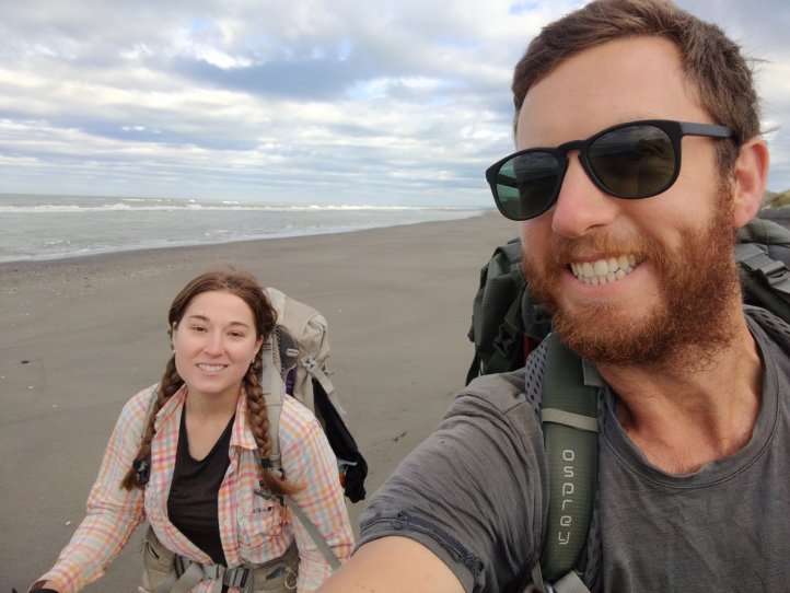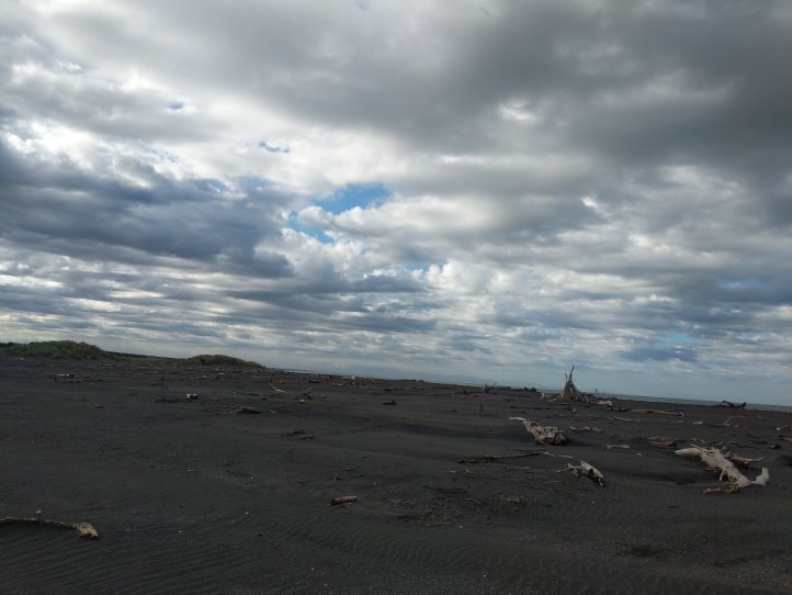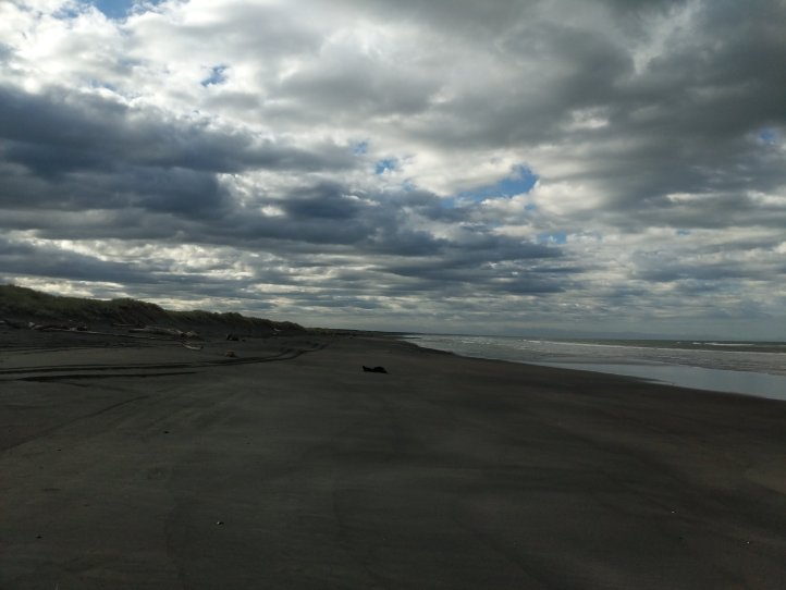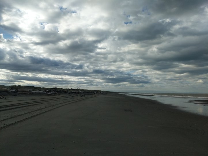 After a windy night we were first to leave the campsite this morning. We immediately got onto the beach and began an 8km track along the sand. It was a nice break from the road and a good warm up to the day but we both were limping pretty bad out the gate. The beach was black sand and covered in drift wood so there was at least some entertainment for this part.