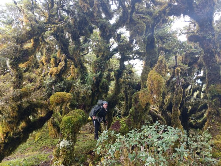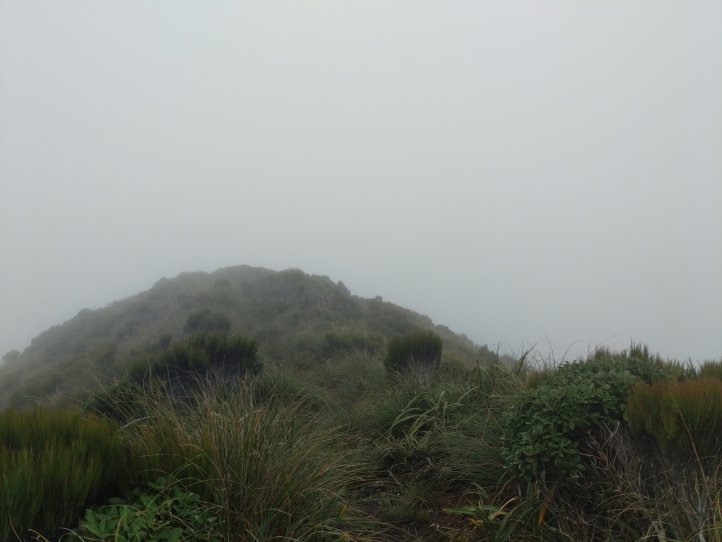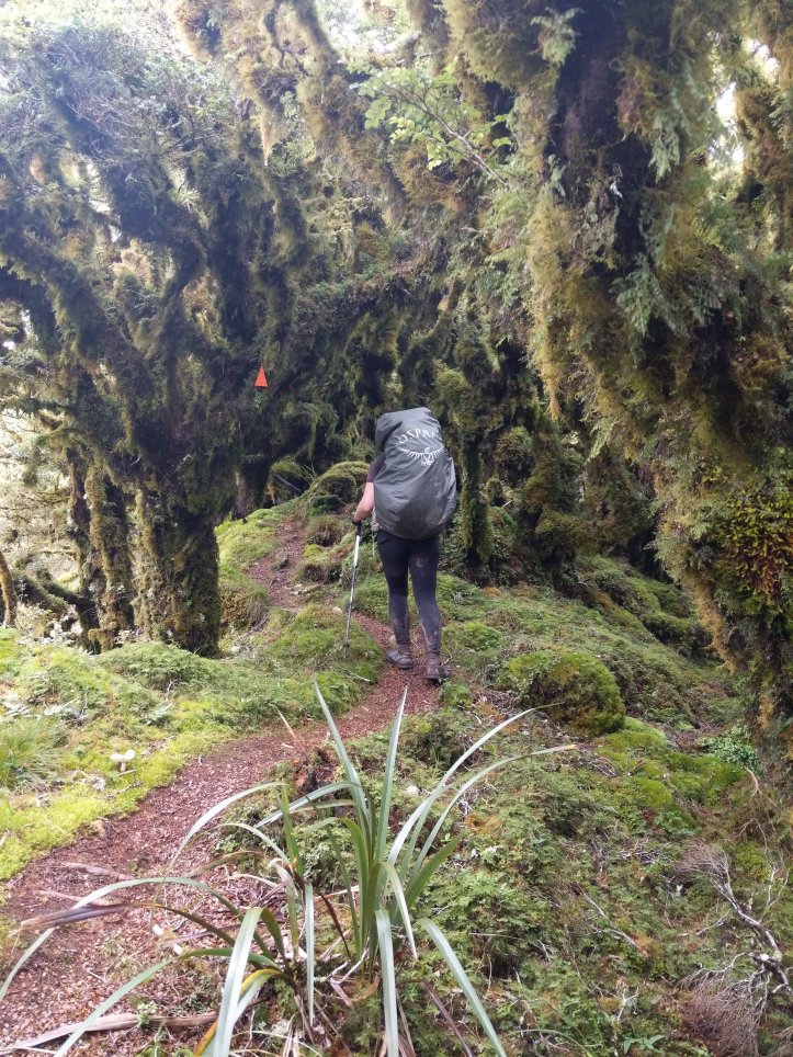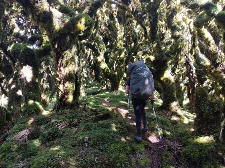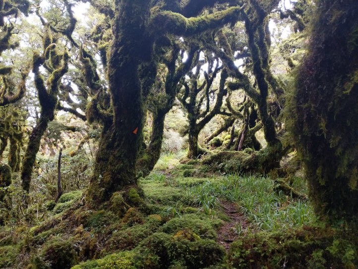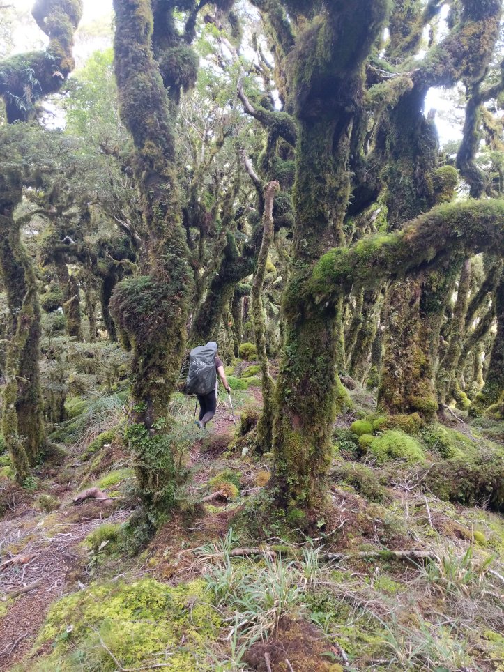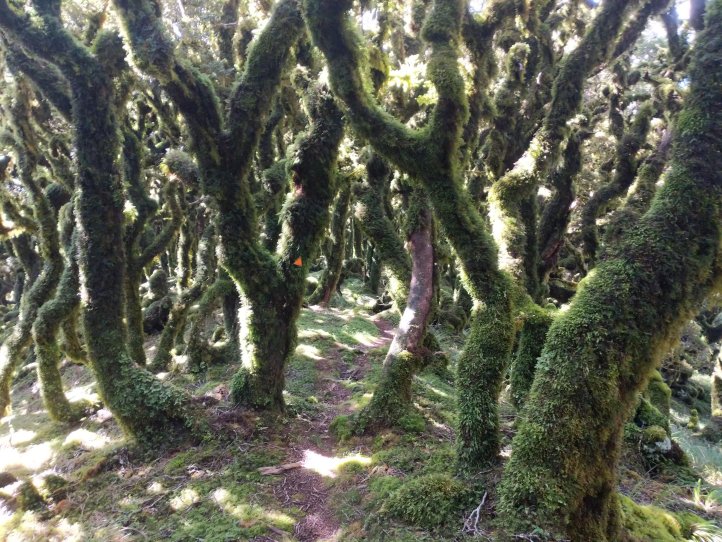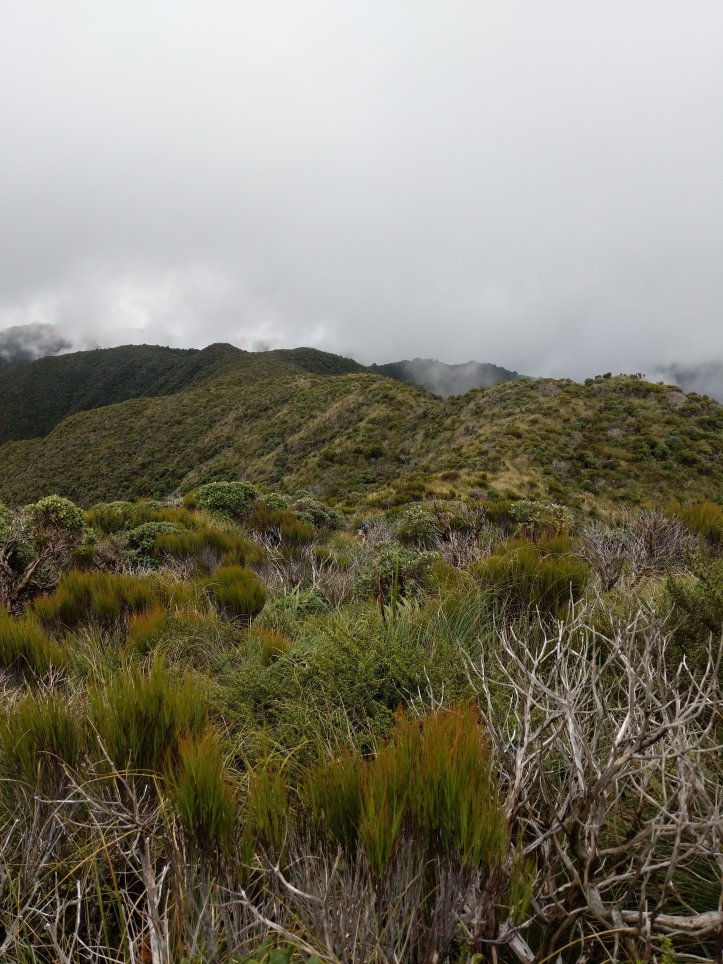 There was a frustrating sign that said 4 hours to our lunch hut 6 hours to our hut for the night. When we reached the summit it said 3-4 hours to our lunch hut and 6-7 hours to our hut for the night. From the summit we turned onto the main ridge and followed that along a ways before descending into bush. The ridgeline was pretty spectacular and the bush was really cool twisted trees covered in moss. There was also a very clear distinction between bush and not bush with the bush being very thick.
