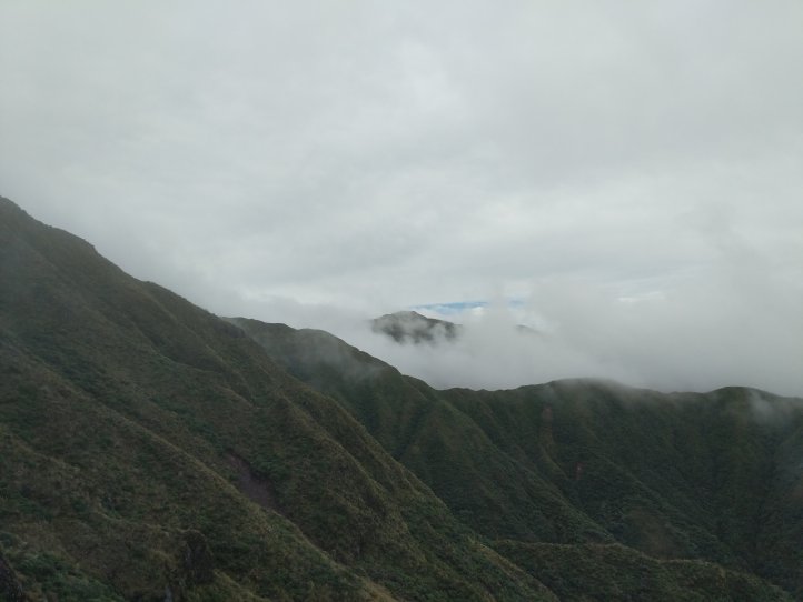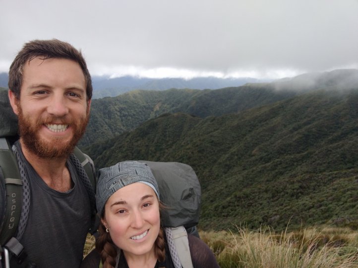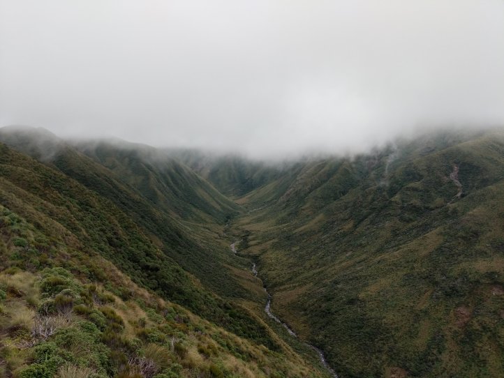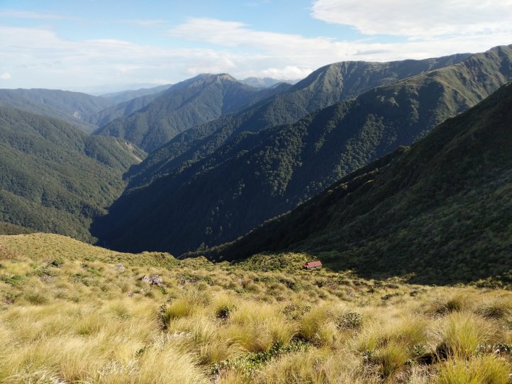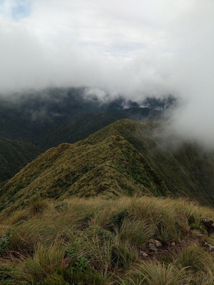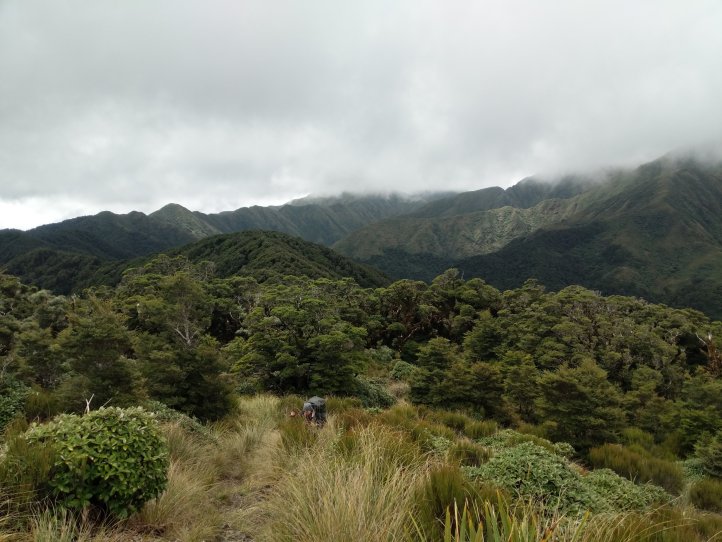 This was probably my favorite day so far on the trail. We had some excellent track that we covered, periodically great views (no rain at least), and made it to our hut feeling good. We started out with a climb up to the ridge we’d been looking at yesterday from the hut. This took about two hours and we were climbing mostly through tussock and clouds with the occasional good view out and back to the hut.