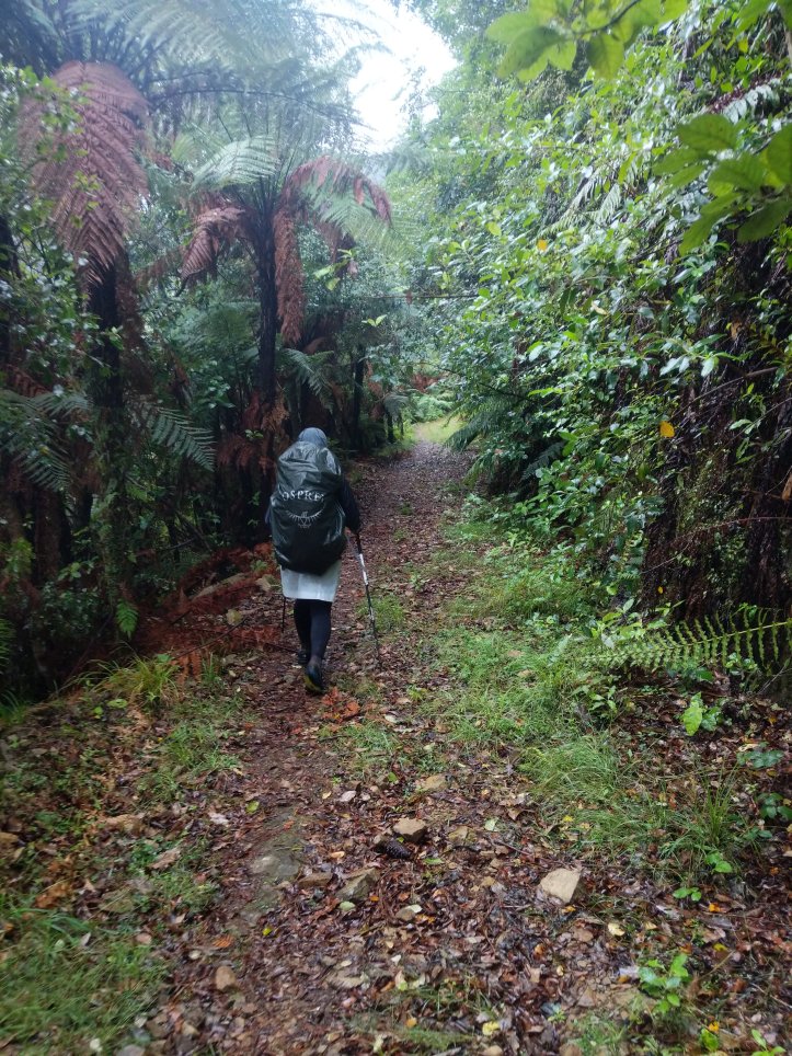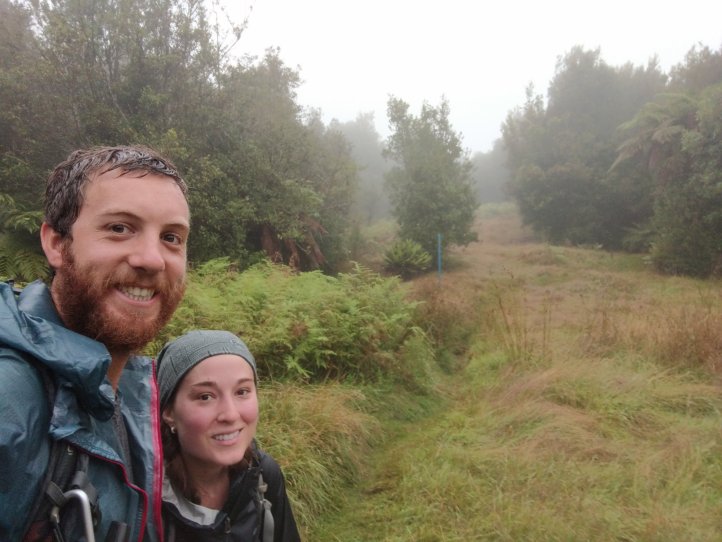 We ended up deciding to pitch our tent on the veranda last night as the hut book talked a lot about mice. We were very grateful we did (and had our first full night’s sleep), when we heard or German friend clapping his hands inside to try and scare the mice away. In the morning he told us he hadn’t slept because of them for a good portion of the night. It did start raining during the night but even without the rainfly we’d been able to stay dry. It wasn’t great heading out into the rain but at least we knew we were heading towards town. We crossed over another swing bridge and after a few km headed up into the bush for a final summit in Tararua Forest Park.