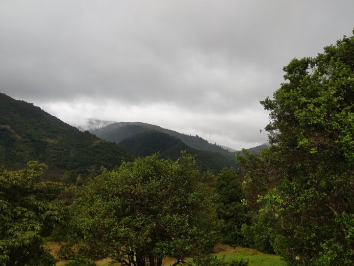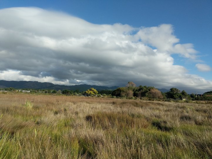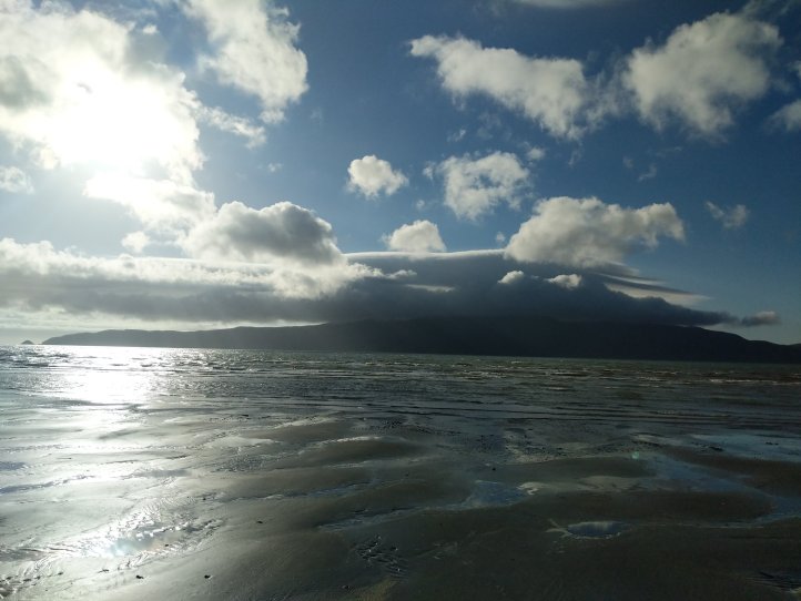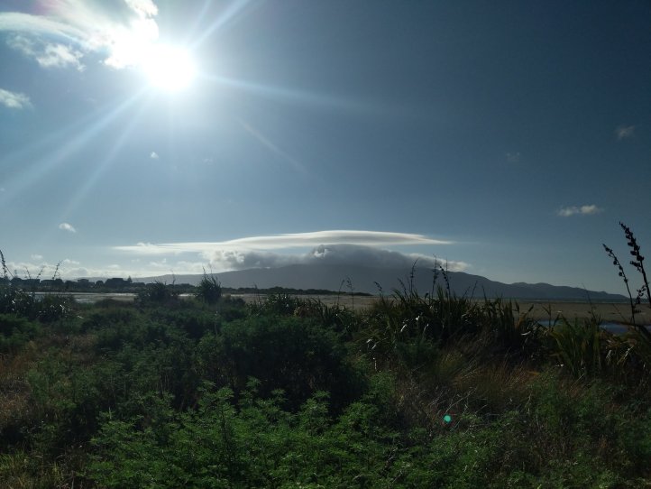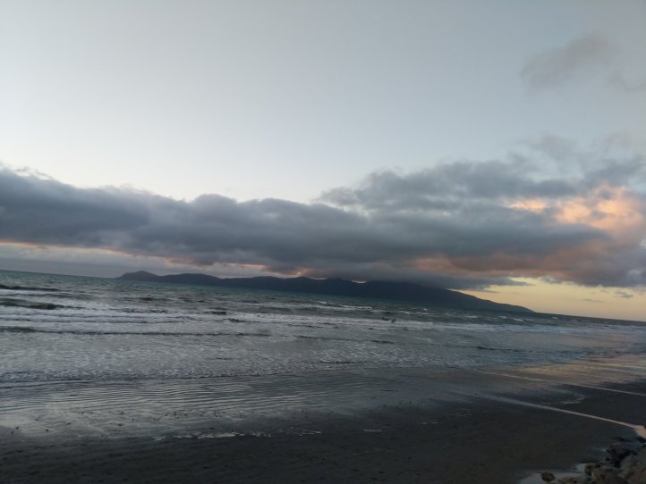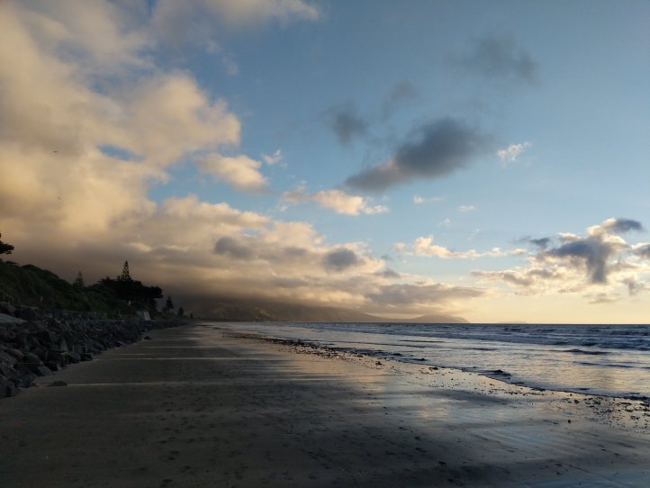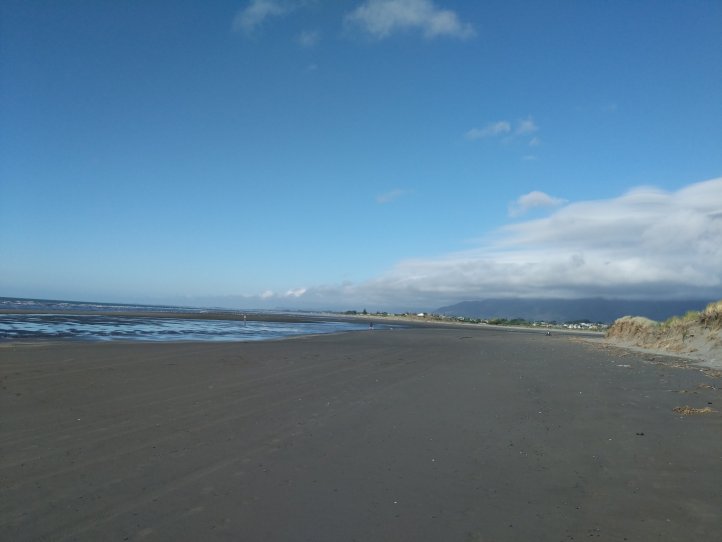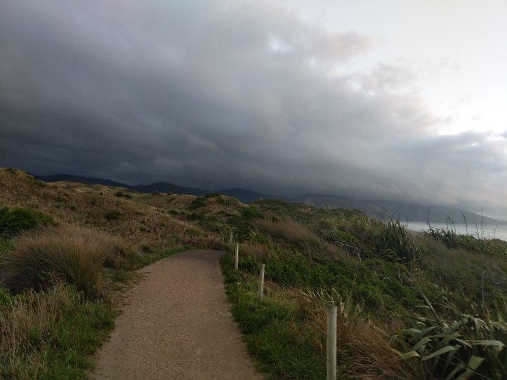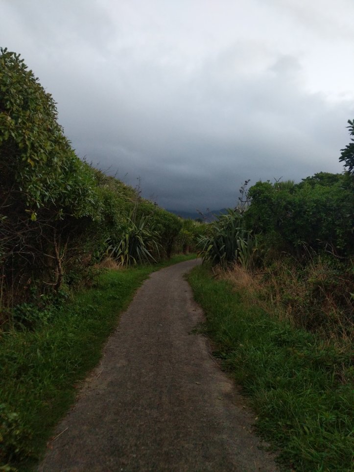 The rain had largely stopped by now and the road wasn’t bad. It was 11km on the road into Waikanae. We had clouds most of the way but as you came out of the valley you could see where the clouds stopped and stayed with the mountains. It was pretty impressive looking back and seeing rain and dark clouds in the mountains but clear blue out over the sea.
