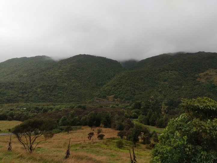 Despite the heavy rain and thick bush the track was surprisingly nice. It was a quick 400m climb to a ridge and then a nice 2 hour walk up a gentle ridgeline to the summit. Unfortunately because of the weather we didn’t have any of the promised views of the Tararuas. We reached the summit a little before noon and started to descend before breaking for lunch. The descent was a good deal tougher than the ascent and the first part of this before lunch was a bit demoralizing to our time. We stopped for a wet lunch on a mossy log and then continued to siddle along the side of the mountain. Luckily, not to long after lunch, we dropped into Heather’s favorite terrain: pine forest. It was amazing the difference between the pine forest and native bush. All of a sudden we were moving quickly through spaced out trees on non slippy pine and the rain even seemed to stop. It wasn’t long after this that we emerged into a valley, came down a few switch backs and after going over a swing bridge popped out onto the road.