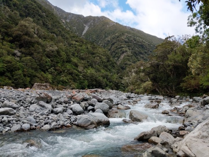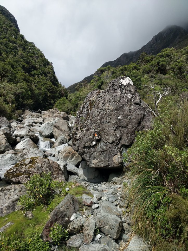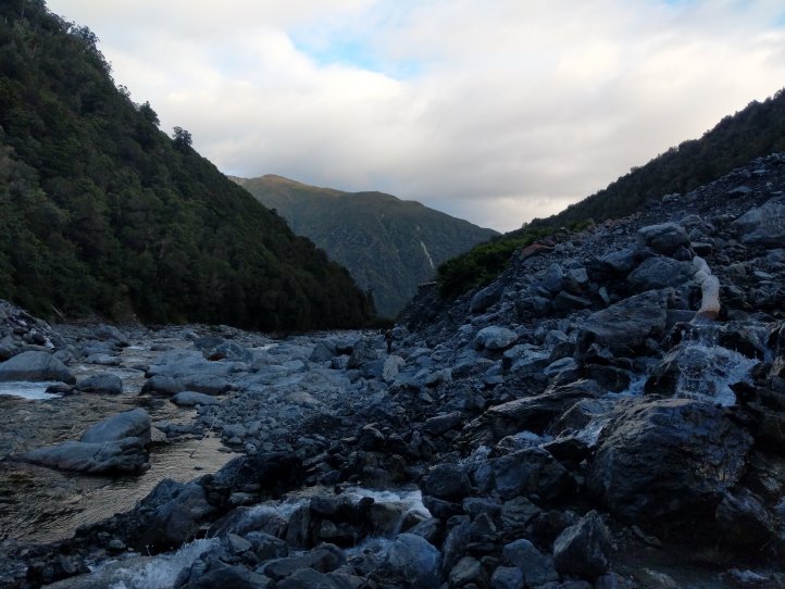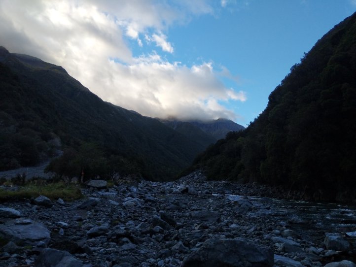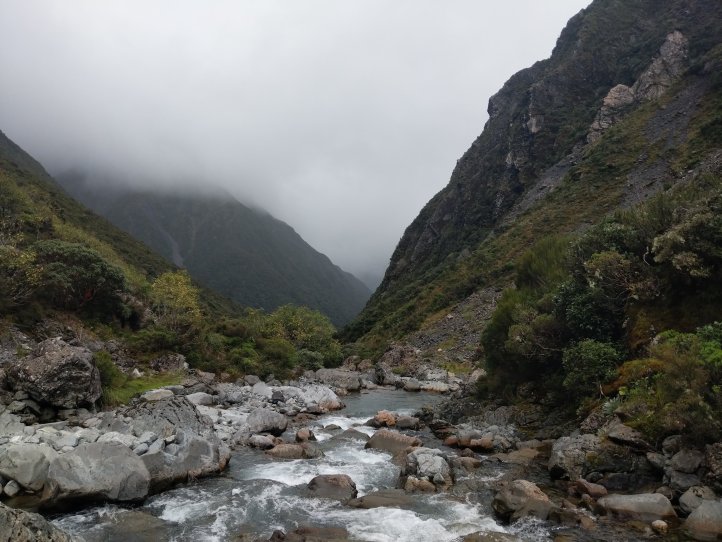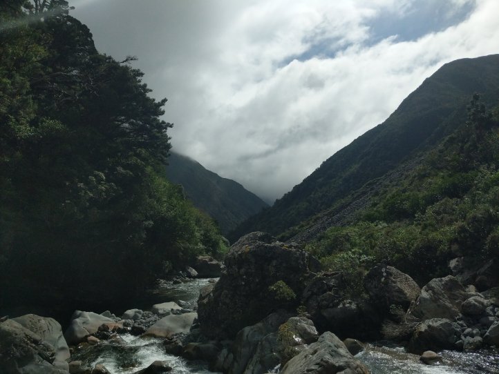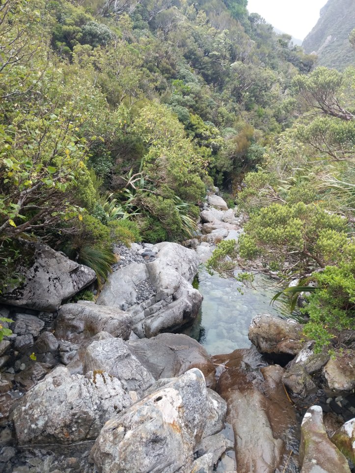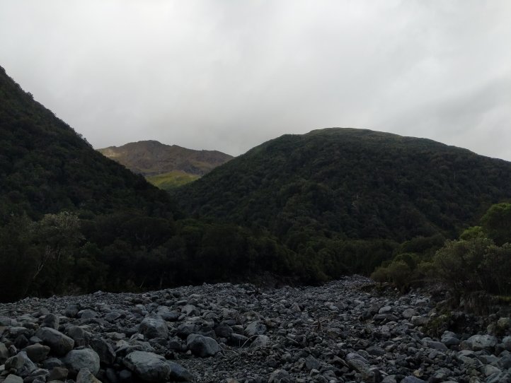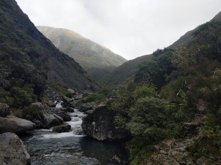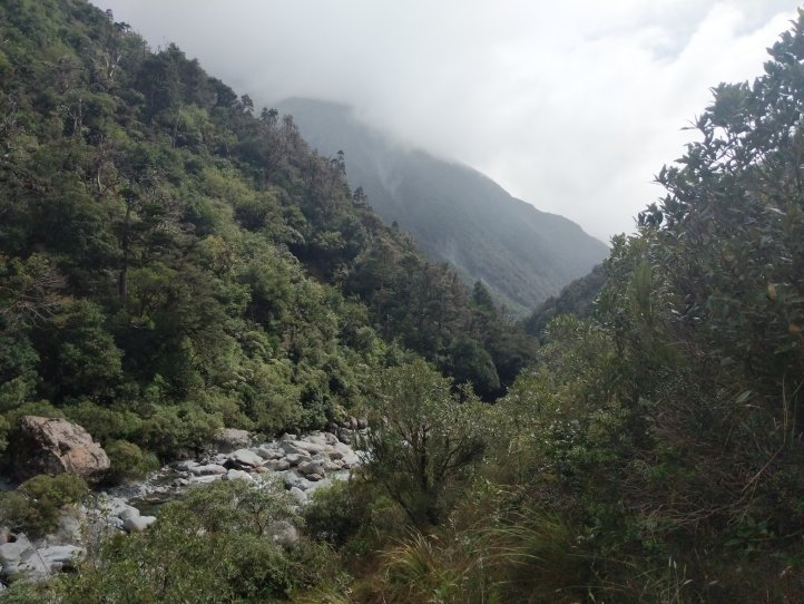 We hit the hut at the top and after a brief pause we decided to continue on. Going on put us in Arthur’s Pass a day early so we’d be able to take a zero and the hut had no fire place and we were cold. Arthur’s Pass was only another 10km downhill so we got going on what was a much nicer trail. It started out with boardwalk over the top of the pass and then descended by the Mingha river and with plenty more rock fields to cross.