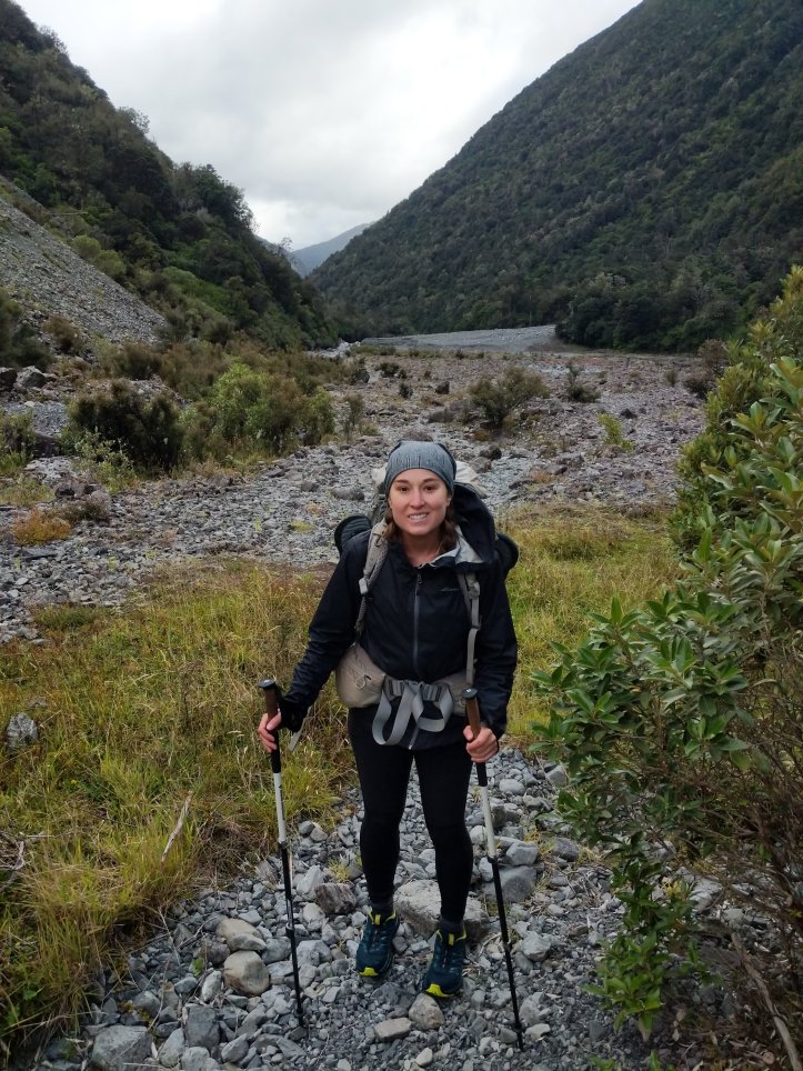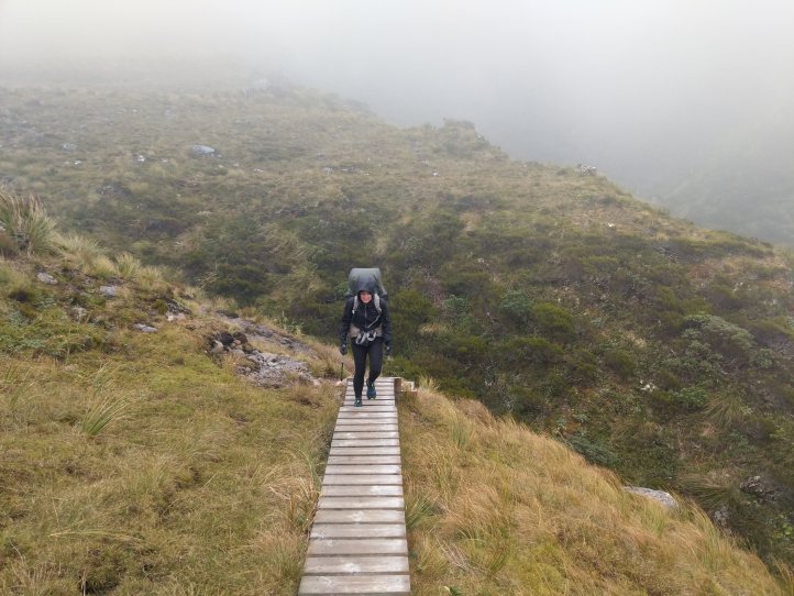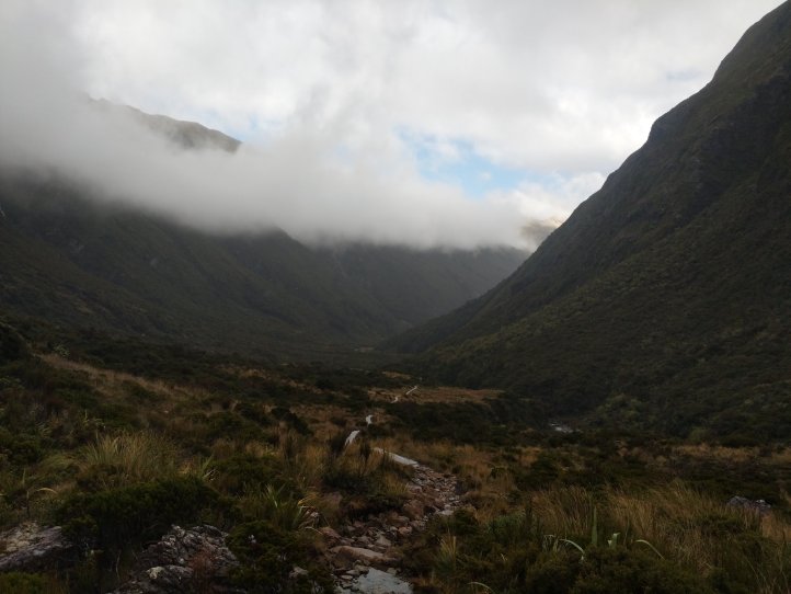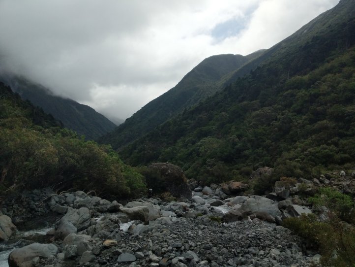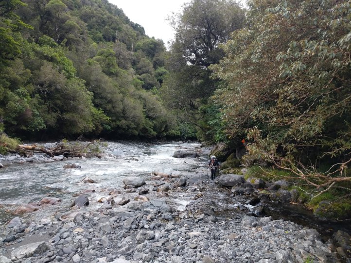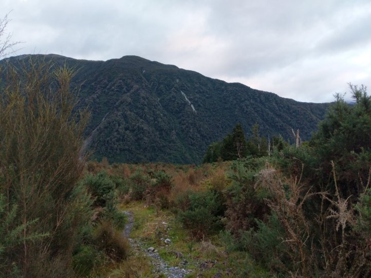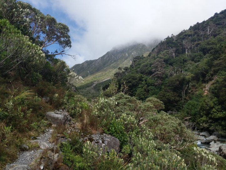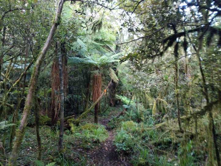 We’d set ourselves up to start the Deception-Mingha track early this morning. It’s a 15km track that’s part of the Coast to Coast race and the notes suggested it’d take 8-9 hours (the fastest runners fo it in three), so we wanted to allow plenty of time. The rain had actually stopped during the night and while not dry we weren’t much wetter than yesterday to start. A runner passed by pretty early while we were packing up. He was heading up and over trying to beat his record best of 6 hours, it was his fourth time over and his parting warning was that we’d get our feet wet. He also said there’d be rain later in the afternoon but we’ve come to expect that at this point.