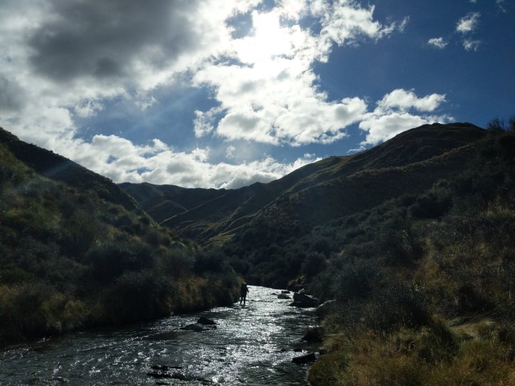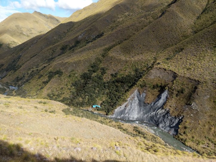 From the top it was a long descent down a spur to the river. Here we had the option of hiking the flood route up and down next to the river or just following the river bed. It wasn’t very high and the rain had largely stopped by now so we went for river bed.