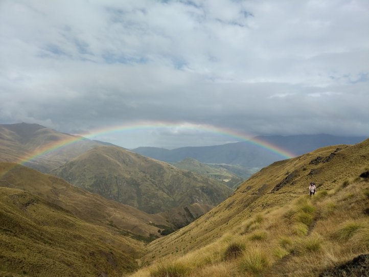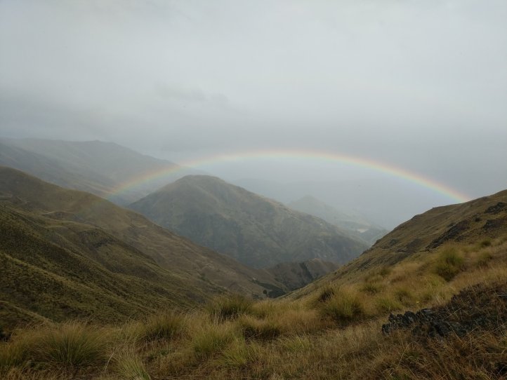 We followed the 4WD track another few kms down out of Macetown and turned up towards Big Hill Saddle. This was our last climb that took us up to 1070m. On the way up we passed the tour group who stopped for a break to let us pass pretty near the bottom. Shortly after that we got a mix of hail and rain that lasted until we were at the top and then cleared up again. We had a great rainbow at the top looking out over Arrowtown.